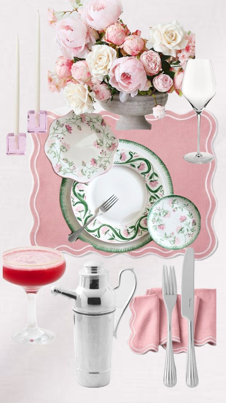 Blush tones, garden style florals, and sculptural details. This palette leans into the ease of summer, delicate without being fussy. I’d use it for a long lunch or early evening drinks in the garden. Add a floral arrangement, a good playlist, and keep the menu light.