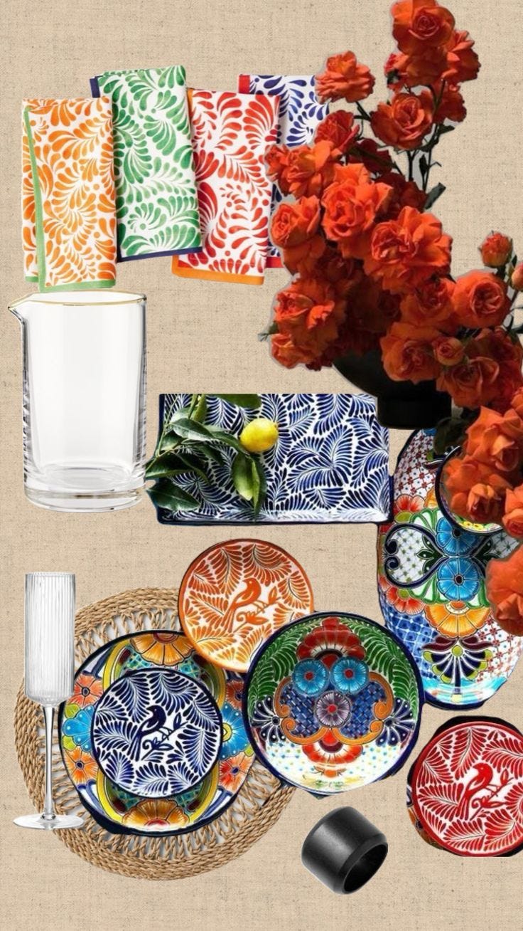 Pattern-forward and full of energy. This look is playful but not chaotic—the palette does the work. I’d use it for a dinner that feels like a celebration: grilled food, fresh citrus, maybe a good tequila cocktail.
